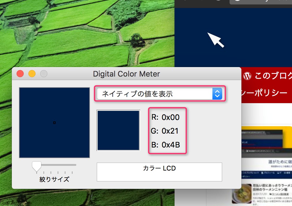 今回は同じことをMacでしますが、Macの場合、標準で付いているDigital Color Meterというアプリを使えばWindowsよりもカンタンにできます。